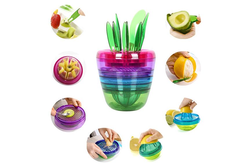 At a glance, my new Fruit Slicer Set ($15) looks like a puzzle. With all the different parts and bold colors, there’s a lot going on. But it solves more problems than it creates—promise! Once you actually break it down, it becomes clear that the 10-in-1 gadget is just as utilitarian as it is pretty. Each tool is designed specifically to helps you cut, peel, and slice any type of fruit like a professional chef.