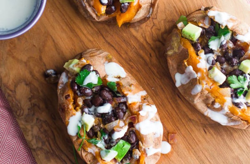 Bake a sweet potato in the oven, cut it open, and top it with black beans, brown rice, and a dollop of yogurt for sour cream, whether that’s a non-dairy option or Greek yogurt.