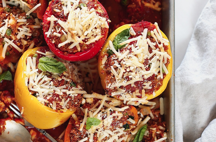 Stuffed bell peppers are always a win. For a flavorful filling, simply use a combo of brown rice, diced onion, and tomato paste. You can also add some cheese on top for a melty finish, whether that’s a non-dairy option or ricotta.