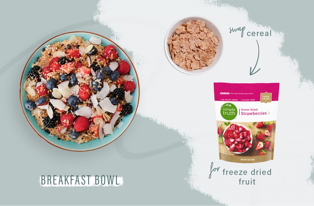 Eating a full-fledged breakfast every morning isn’t always doable, which is why cereal heads up the frontlines of weekday morning eats (no, it’s not just for kids). If you opt for a bowl, Martinez suggests swapping out one-third cup of cereal and adding in Simple Truth freeze dried fruit (OptUP 80), specifically strawberries.