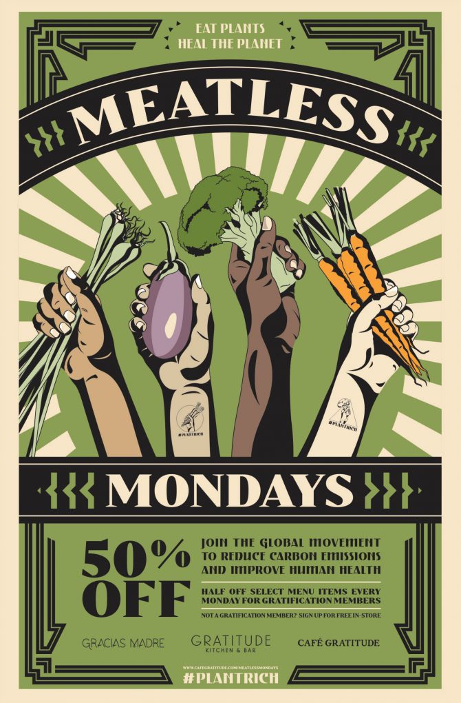 Southern California’s Café Gratitude, Gracias Madre, and Gratitude Kitchen & Bar (all part of the Love, Serve, Remember restaurant group) are some of the latest to throw their hat into the #MeatlessMonday ring. All three are set to begin a three-month-long Meatless Mondays promo (starting May 13th), giving guests a whopping 50 percent discount on select items from their much-beloved plant-based menu.