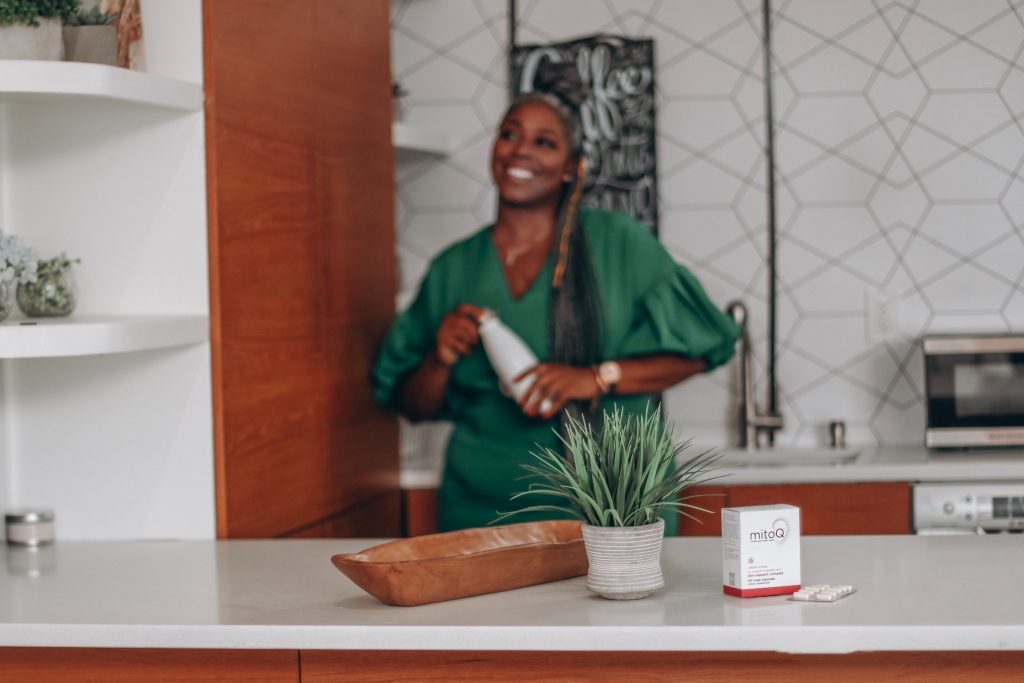 Now, Alexander takes special care to incorporate youth-supporting products into her routine, like a vitamin C serum, a hydrating sleep mask, and MitoQ Skin Support Complex, which is a unique form of CoQ10—an antioxidant that helps the body fight free-radical damage associated with aging.
