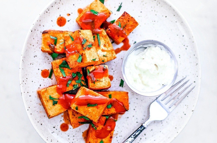 5. Crispy buffalo tofu bites with garlicky yogurt dip
