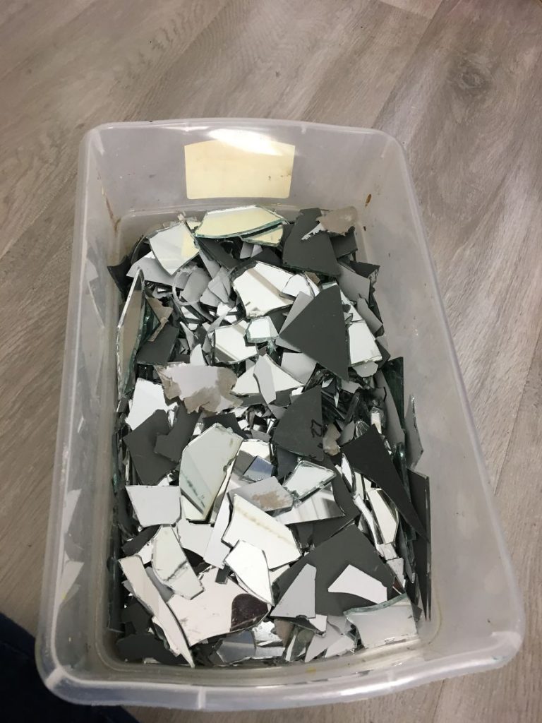 Broken up mirrors for the mosaic garland. Good thing we aren’t superstitious!